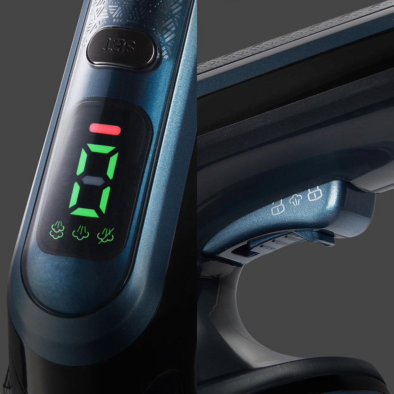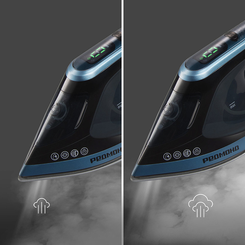 Встроенный дисплей отображает выбранный режим работы, а специальный фиксатор позволяет подавать пар непрерывно — без необходимости постоянно держать кнопку. Это делает использование отпаривателя максимально удобным даже при обработке большого объема одежды.