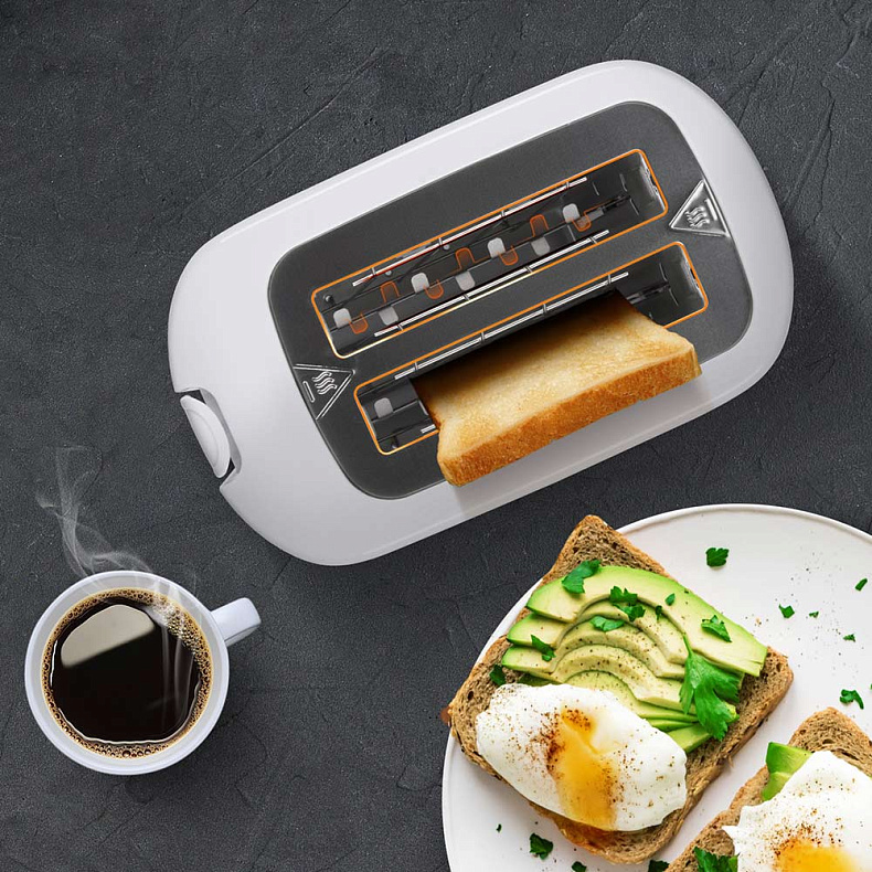 Тостер поджаривает сразу 2 хлебных ломтика. Готовые тосты автоматически поднимаются вверх, чтобы вам было удобно их вынуть.