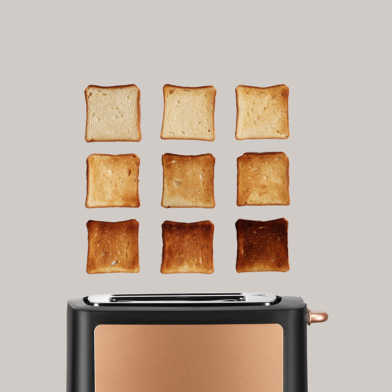 Тостер устроен таким образом, что хлеб помещается ровно по центру слотов. В результате они одинаково поджариваются со всех сторон. По готовности тосты приподнимаются наверх.