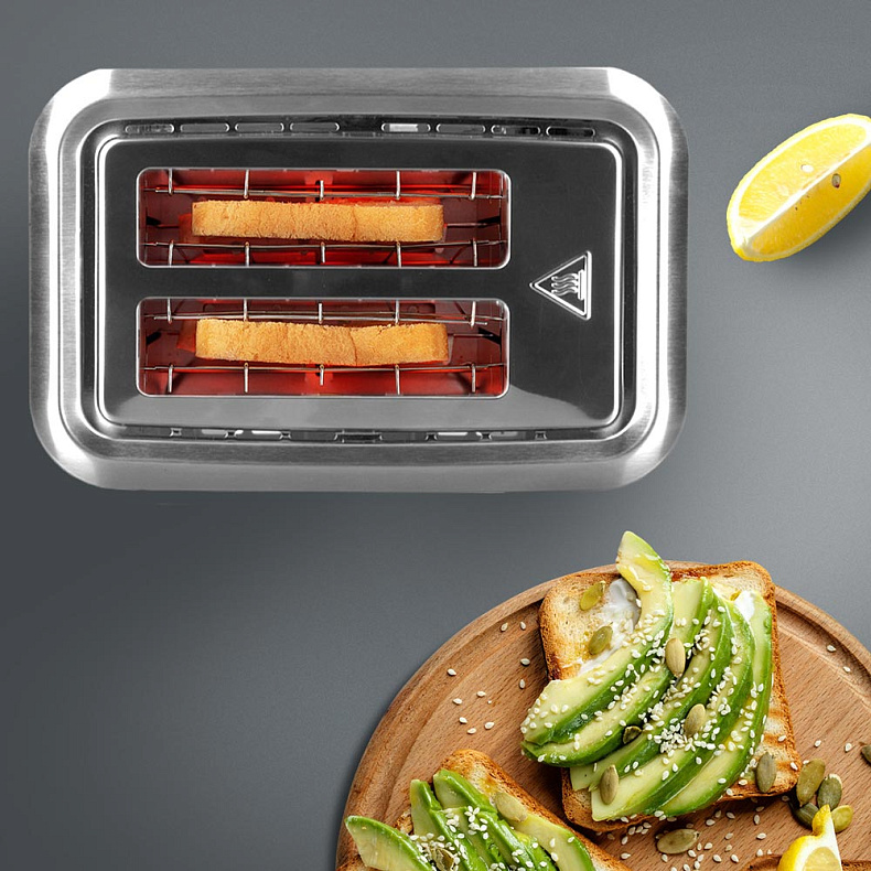Тостер автоматически располагает ломтики так, чтобы они поджарились равномерно с обеих сторон. Когда тосты будут готовы, прибор не подбросит их, а аккуратно приподнимет — так вам будет легко их извлечь.