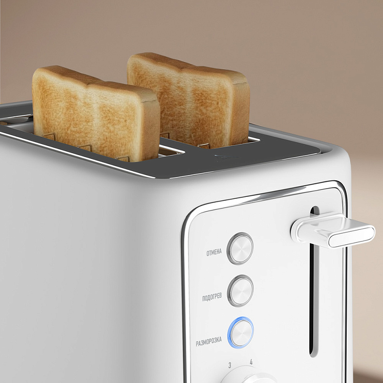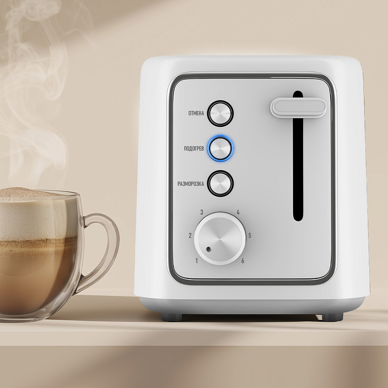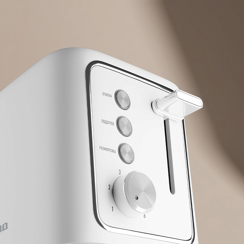 Тостер позволяет регулировать степень поджаривания от легкой золотистой корочки до более хрустящей. Уровни 1–2 подходят для подрумянивания, 3–4 — для сбалансированного результата, 5–6 — для более интенсивного поджаривания. Управление простое и понятное.