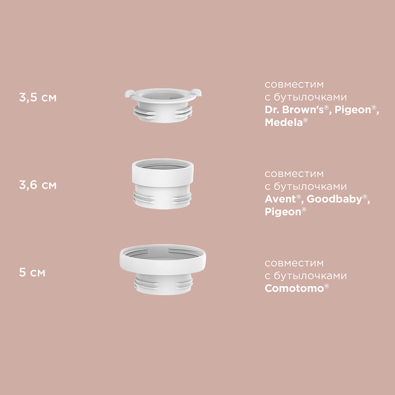 *Зарегистрированные торговые марки. Принадлежат компаниям: Koninklijke Philips N.V., Нидерланды, Нью-Вент Дезайнс, Инк., США, ПИДЖИН КОРПОРЕЙШН, Япония, Comotomo Corporation, Корея, Medela Holding AG, Швейцария и приводятся для информирования потребителя о совместимости адаптеров, подходящих к подогревателю.