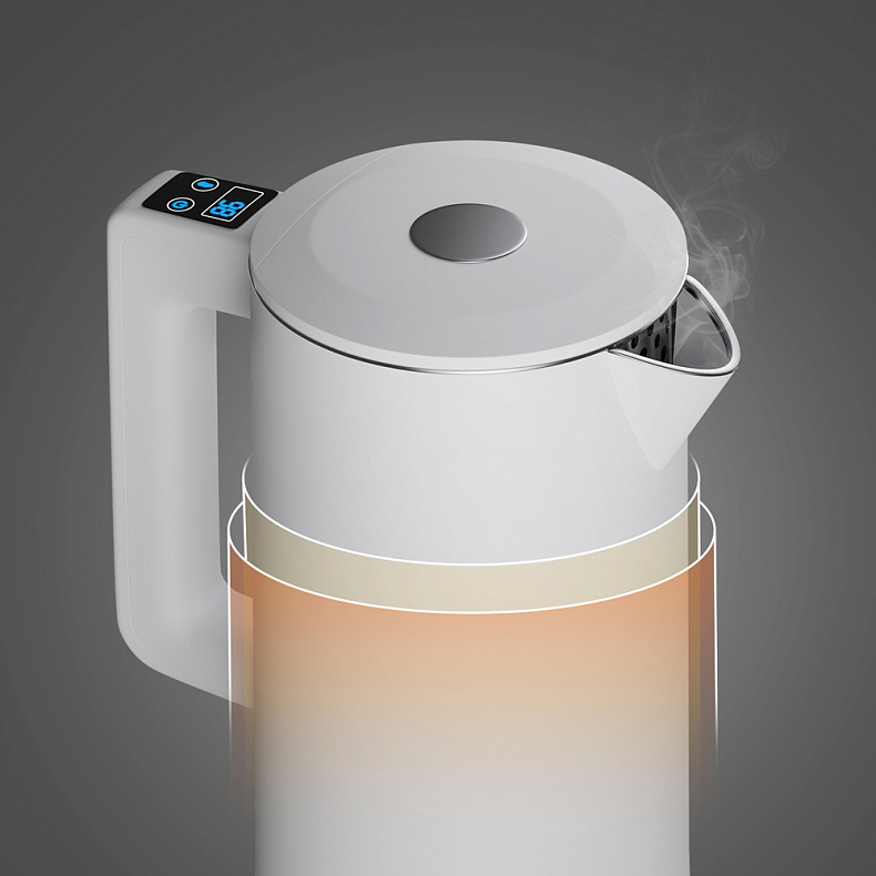Имеет двойные стенки и работает как термос: дольше сохраняет температуру воды. Внешняя часть чайника совсем не нагревается, поэтому можно не бояться ожогов. Прибор полностью безопасен.