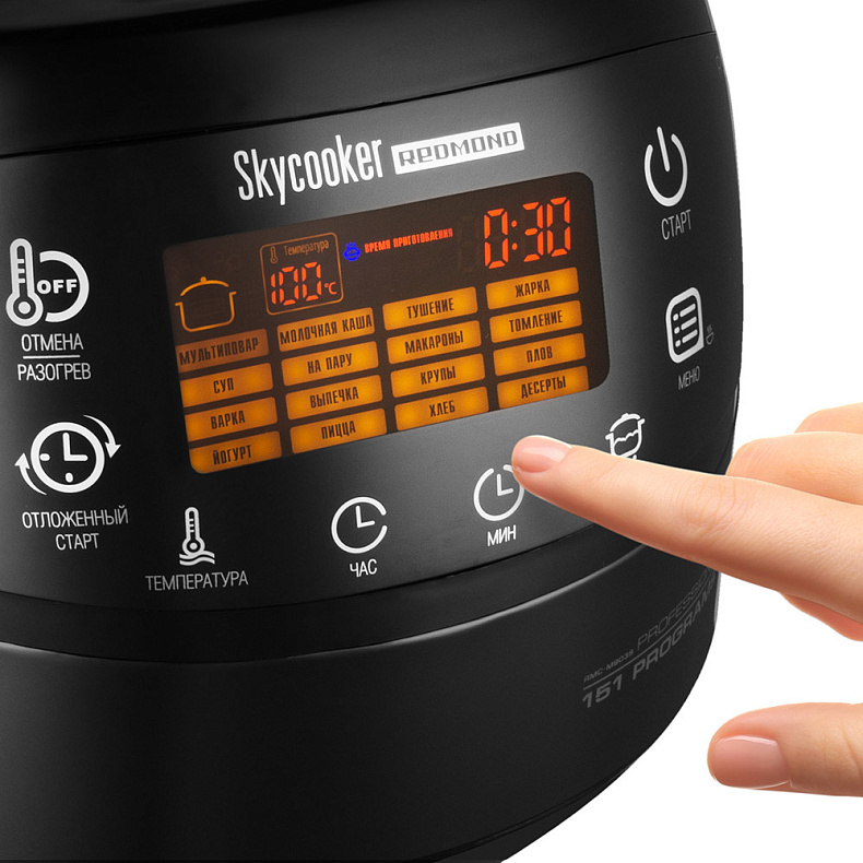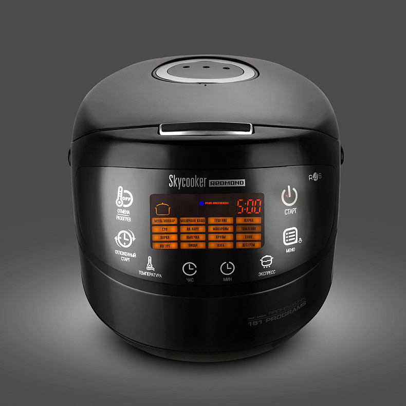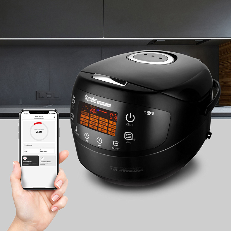 Подключив мультиварку к мобильному приложению Ready for Sky REDMOND, вы сможете запускать и останавливать работу программ, управлять функцией разогрева и отложенного старта.