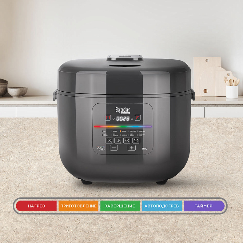 Специальная шкала подсветит своим цветом каждый этап приготовления. Если вы на кухне не постоянно и заходите время от времени, то индикация сразу подскажет, что прибор уже нагрелся или блюдо приготовилось.