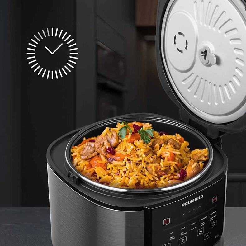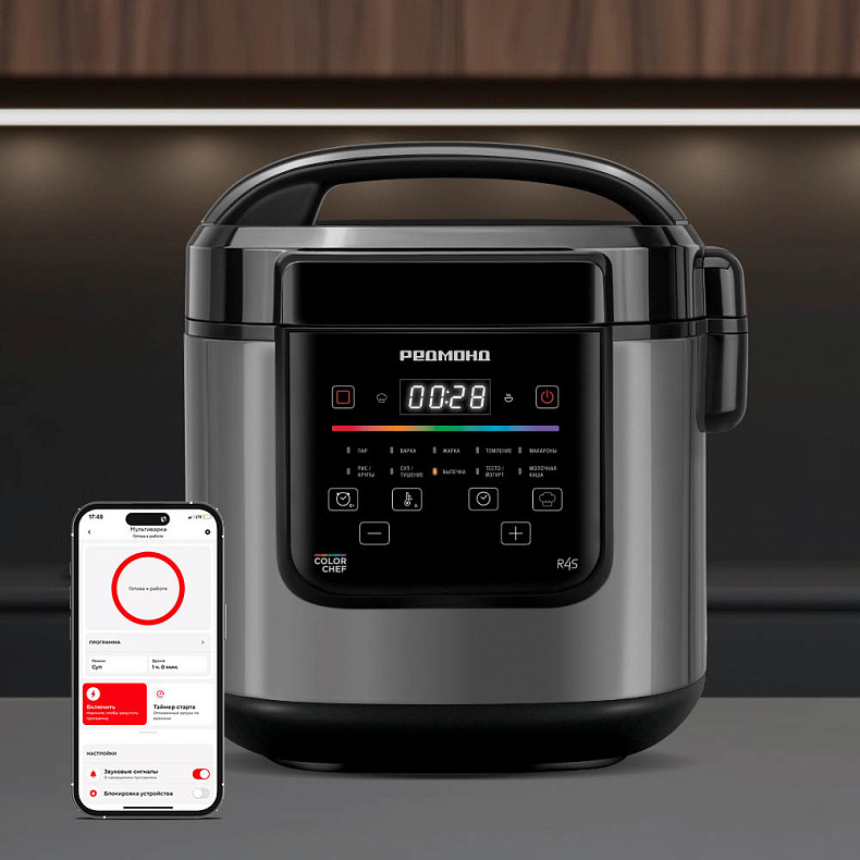 Регулируйте параметры приготовления дистанционно с помощью приложения для смартфона или планшета Ready for Sky REDMOND. Вы можете выбрать автопрограмму, настроить температуру и время, включить автоподогрев или разогрев пищи.