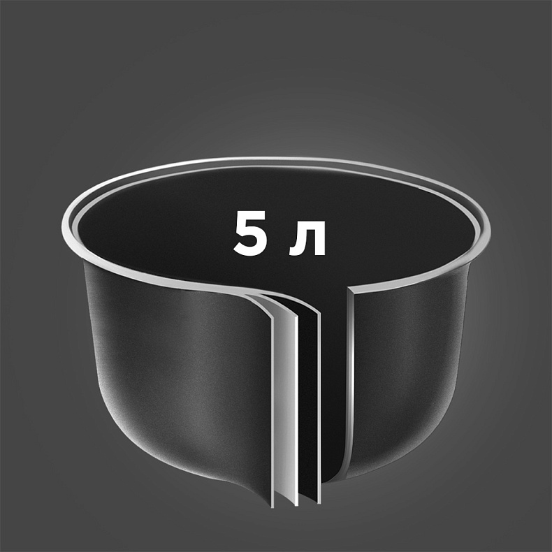 Предназначена для приготовления 6–8 порций блюд и отлично подходит для большой семьи или приема гостей. Она выполнена из безопасных материалов, которые способствуют равномерному распределению тепла и качественному приготовлению пищи. Надежное антипригарное покрытие предотвращает прилипание продуктов и упрощает последующий уход. Общий объем емкости (вместимость до краев) составляет 5 литров, а полезный, рекомендованный для готовки объем — 4 литра, что обеспечивает стабильную и эффективную работу прибора.