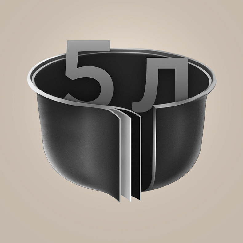 Чаша увеличенной вместимости предназначена для приготовления 6–8 порций блюд и отлично подходит для большой семьи или приема гостей. Она выполнена из безопасных материалов, которые способствуют равномерному распределению тепла и качественному приготовлению пищи. Надежное антипригарное покрытие предотвращает прилипание продуктов и упрощает уход за чашей. Полный объем емкости (вместимость до краев) составляет 5 литров. А полезный, рекомендованный для готовки объем — 4 литра, что обеспечивает стабильную и эффективную работу прибора.