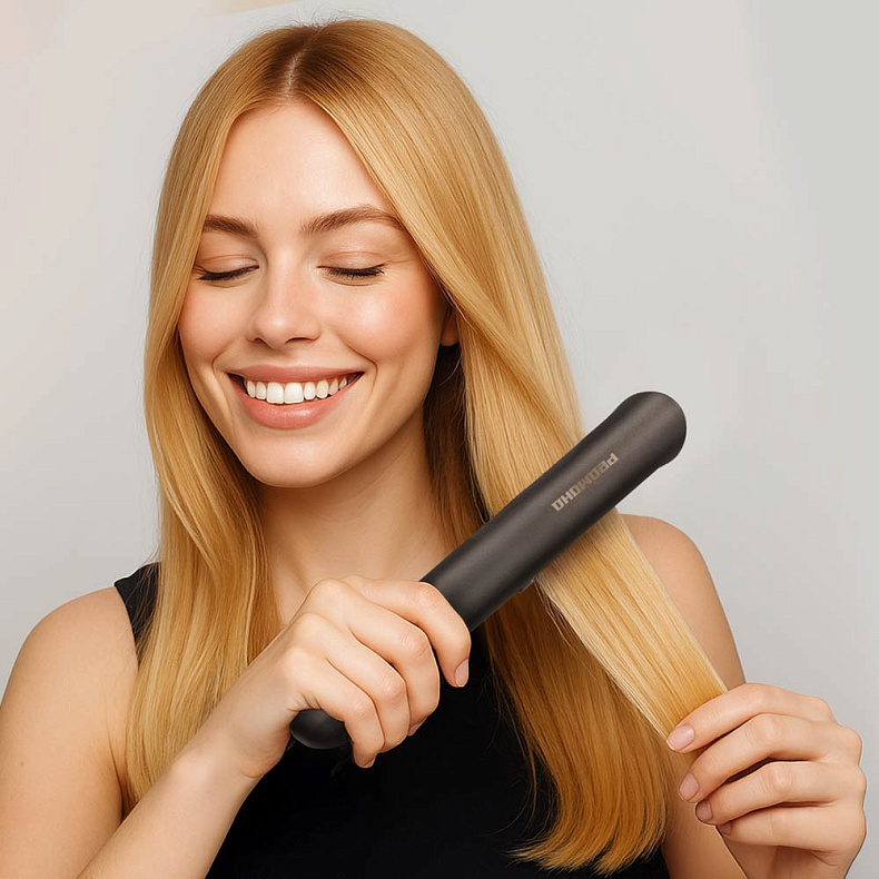 Пластины из керамики обеспечивают плавное и мягкое скольжение по волосам, уменьшая трение и риск повреждений. Материал нагревается равномерно, что исключает пересушивание отдельных прядей. Укладка будет бережной.
