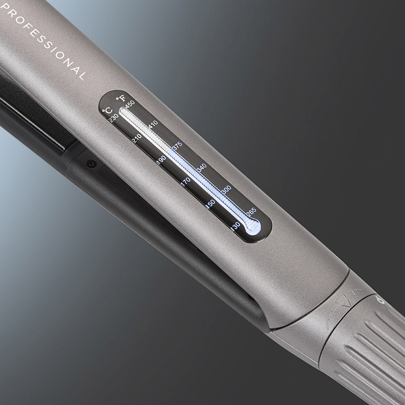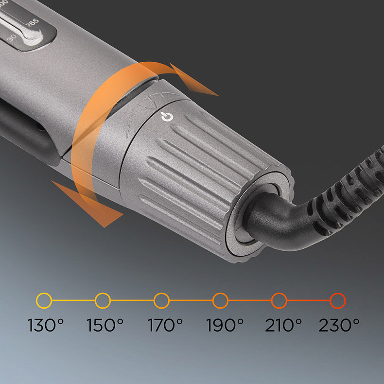 Широкий диапазон степеней нагрева — от 130 до 230 градусов — подойдет каждому типу волос.