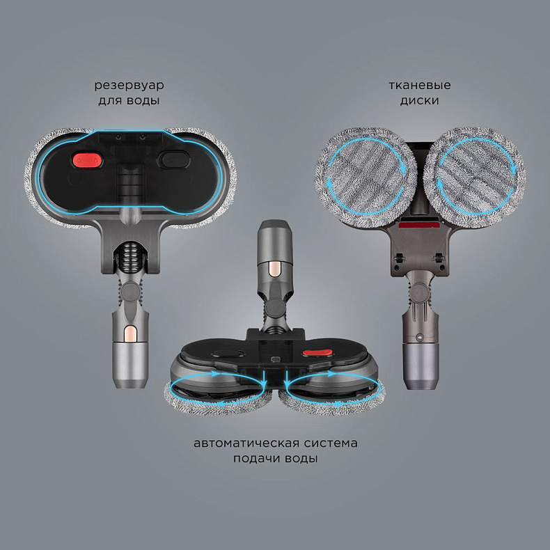 • Влажная уборка. Специальная насадка с резервуаром для воды, системой автоматической подачи воды и двумя вращающимися мопами позволяет добиться идеальной чистоты пола.