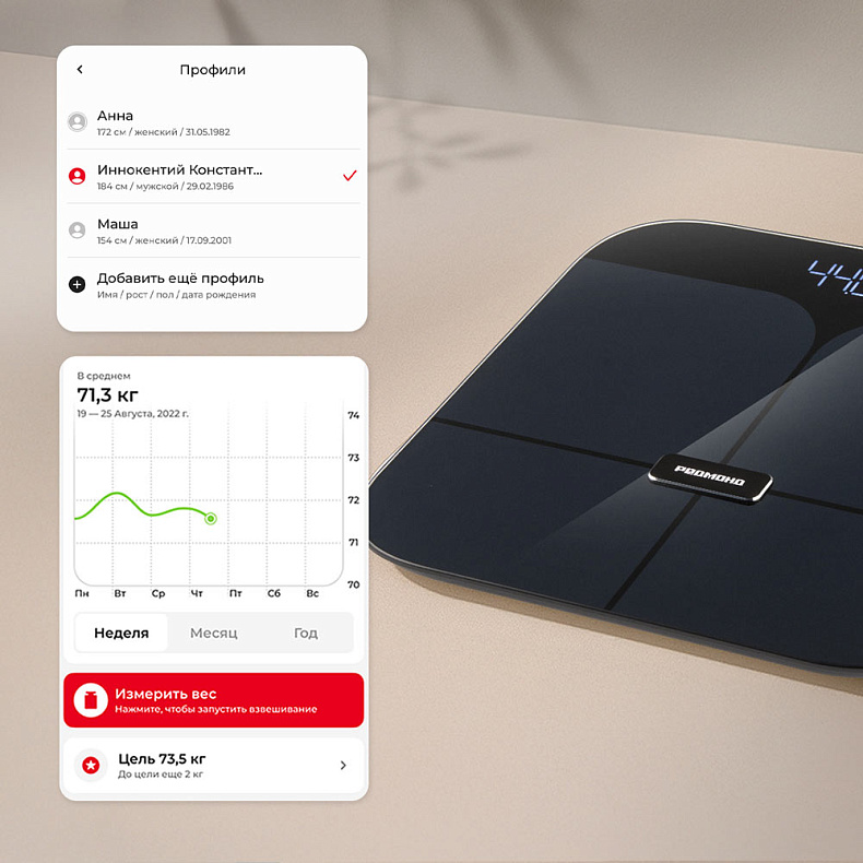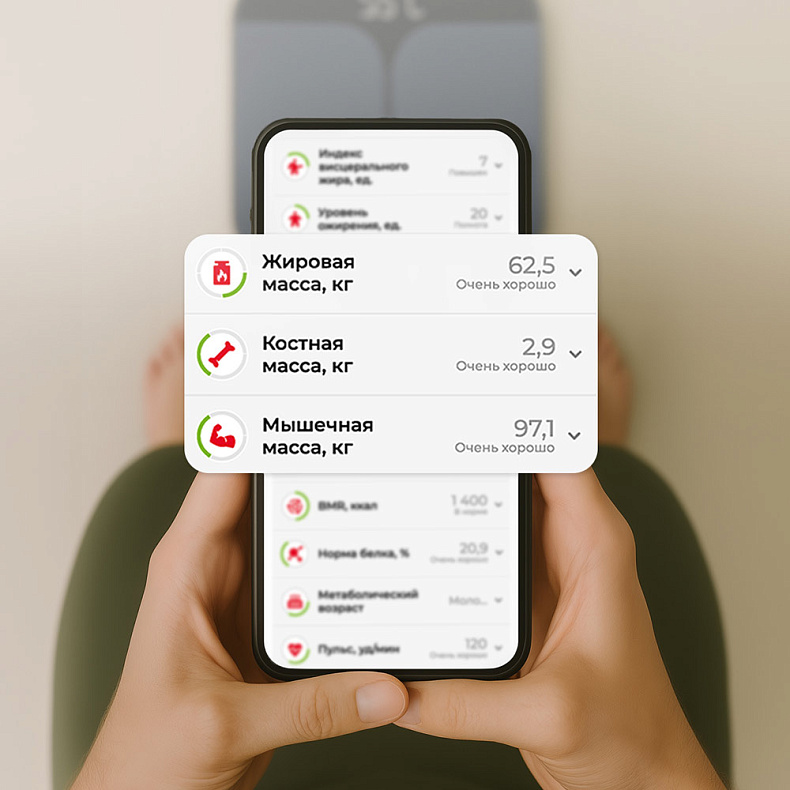 Напольные весы фиксируют данные о жировой, мышечной и костной массе. Благодаря этой информации вам будет легче отследить состояние своего организма, составить эффективную стратегию тренировок и достичь желаемого результата.