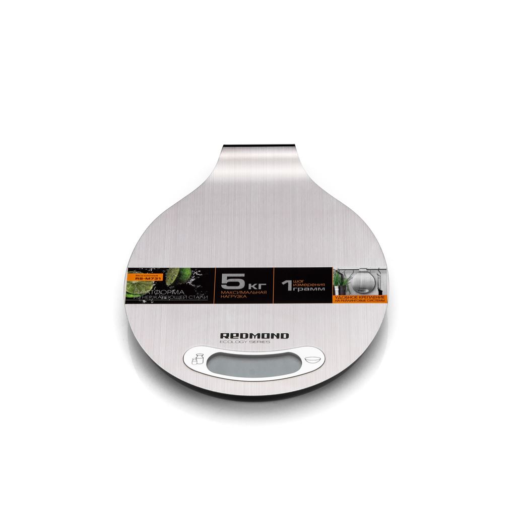 Кухонные весы REDMOND RS-M731— новый уникальный прибор с платформой из нержавеющей стали в ультрастильном дизайне, предназначенный для взвешивания продуктов весом до 5 килограммов в бытовых условиях. Ключевым преимуществом данной модели является возможность удобного крепления на рейлинговые системы — высокотехнологичный аппарат можно практично подвешивать над столешницей.