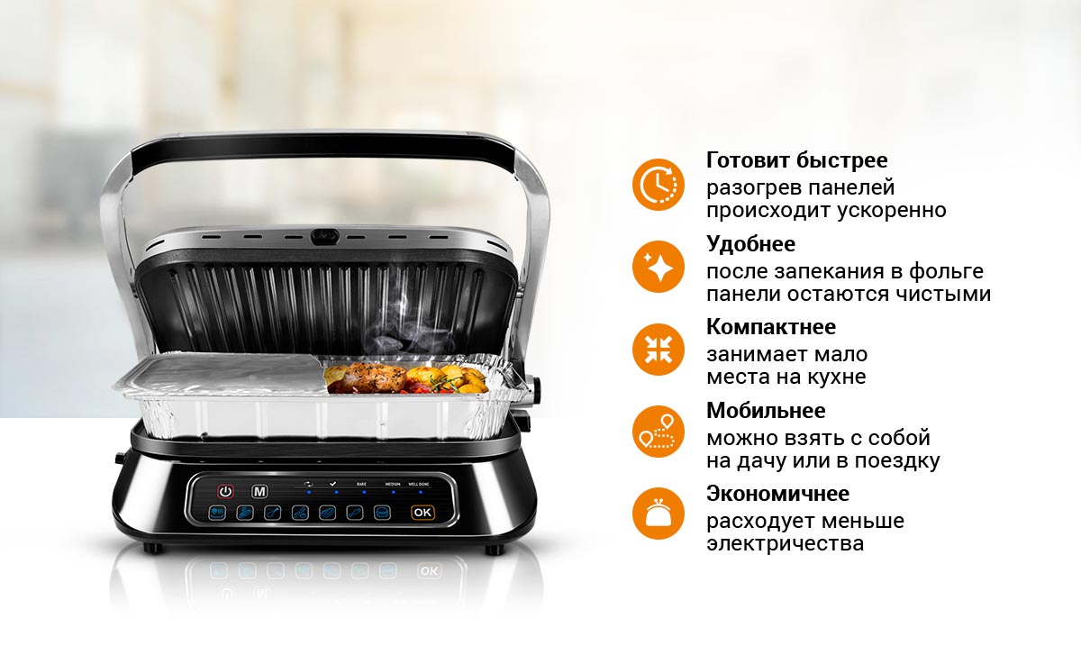 SteakMaster готовит барбекю без дыма, поэтому его можно свободно использовать на кухне в городской квартире, на даче или даже в гостиной – прямо во время вечеринки или семейного ужина!