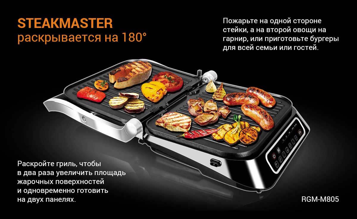 SteakMaster M805 можно раскрыть на 180° и использовать в качестве барбекю-жаровни. На двух панелях сразу вы сможете приготовить легкие закуски из морепродуктов или овощей, пожарить мясо или сосиски для домашних бургеров и хот-догов, сделать экзотические десерты с карамелизованными фруктами.