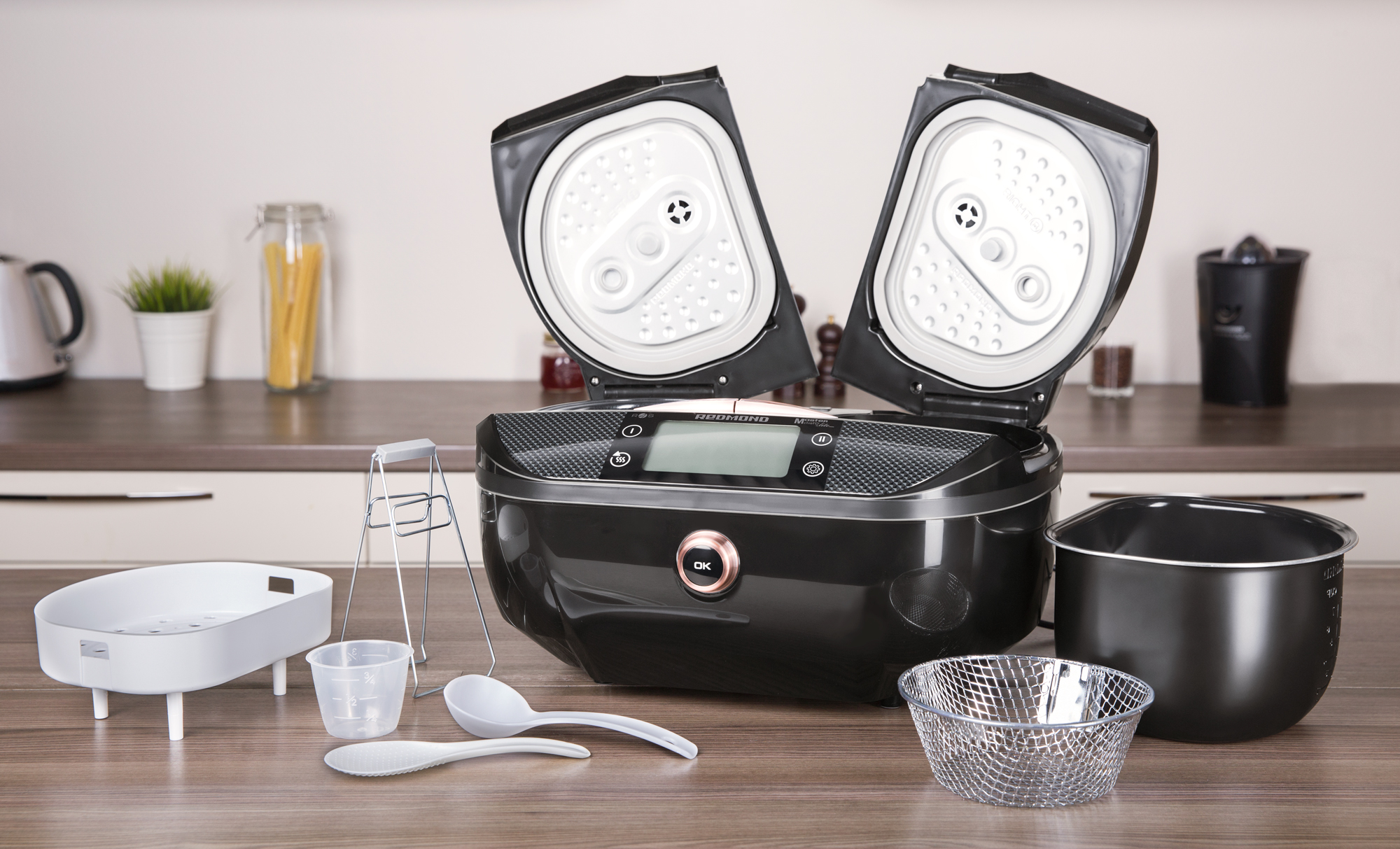 Особое внимание представители REDMOND уделили презентации уникальной мультиварки CBD100S с запатентованной брендом технологией Double Chef. Мультиварка оснащена двумя чашами с отдельными нагревательными элементами: прибор позволяет одновременно готовить два совершенно разных блюда, используя при этом любые автоматические программы мультиварки. Благодаря этому решению пользователь, не имеющий времени готовить или не обладающий достаточными кулинарными навыками, получает возможность готовить дома полноценные здоровые блюда для себя и семьи. Нагревательные элементы для чаш CBD 100S абсолютно независимы друг от друга: чаши можно использовать одновременно (например, для приготовления основного блюда и десерта) или по отдельности. Управлять всеми программами и функциями мультиварки можно со смартфона: например, из офиса в один клик запустить приготовление ужина к своему возвращению или в середине дня подогреть обед для ребенка.